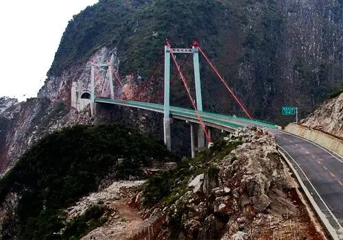 预应力钢筋砼加劲板梁悬索桥,桥长507.96米,主跨278米,桥面至河面高差为250米。于1999年5月开工,于2000年12月竣工。