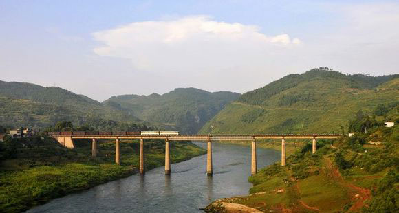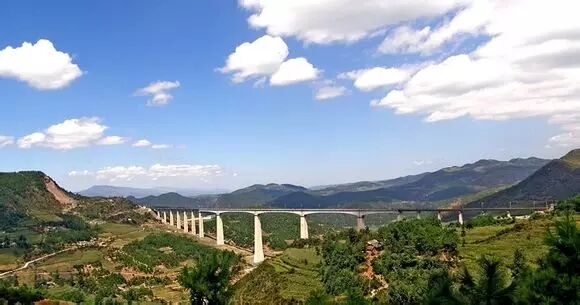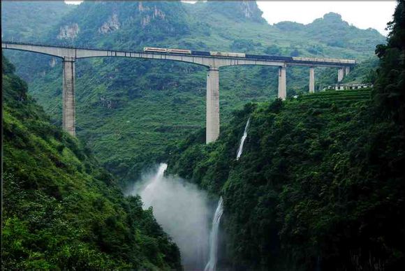 南昆铁路 清水河大桥 全长360米,最高桥墩100米,最大跨度128米 横跨马岭河大峡谷