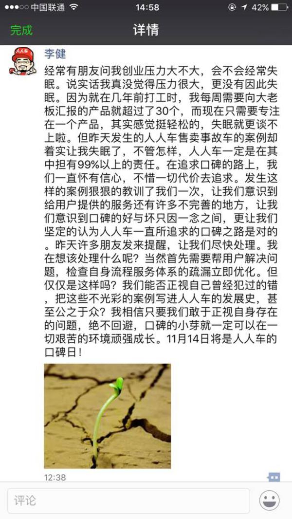 “经常有朋友问我创业压力大不大,会不会经常失眠。说实话我真没觉得压力很大,更没有因此失眠。因为就在几年前打工时,我每周需要向大老板汇报的产品就超过了30个,而现在只需要专注在一个产品,其实感觉挺轻松的,失眠就更谈不上啦。但昨天发生的人人车售卖事故车的案例却着实让我失眠了,不管怎样,人人车一定是在其中担有99%以上的责任。在追求口碑的路上,我们一直怀有信心,不惜一切代价去追求。发生这样的案例狠狠的教训了我们一次,让我们意识到给用户提供的服务还有许多不完善的地方,让我们意识到口碑的好与坏只因一念之间,更让我们坚定的认为人人车一直所追求的口碑之路是对的。昨天许多朋友发来提醒,让我们尽快处理。我在想该处理什么呢?当然首先需要帮用户解决问题,检查自身流程服务体系的疏漏立即优化。但仅仅是这样吗?我们能否正视自己曾经犯过的错,把这些不光彩的案例写进人人车的发展史,甚至公之于众?我相信只要我们敢于正视自身存在的问题,绝不回避,口碑的小芽就一定可以在一切艰苦的环境顽强成长。11月14日将是人人车的口碑日!”