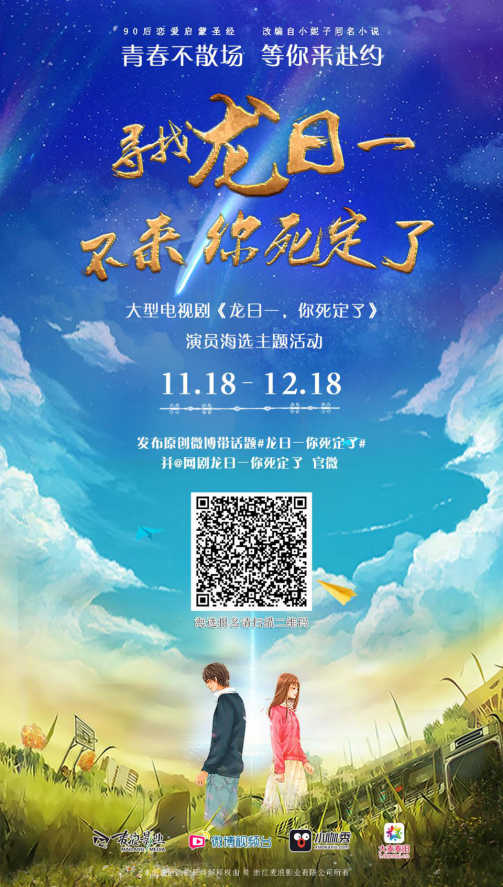 “90后恋爱启蒙圣经、小妮子畅销小说、大IP作品”,这样的标签让网剧《龙日一,你死定了》先声夺人。今日,一场以“寻找龙日一”为主题的演员海选活动在网络启动,活动将召集一批有颜值、有梦想、有才华的新生代鲜肉们的参与,他们将通过才艺比拼展示自己的十八般本领,本次活动将选出最符合网友心中小说人物形象的新星参与本剧,相信这场备受瞩目的选秀活动在主办方麦浪影业、新浪微博、小咖秀的联合推动之下引起85/90后集体青春回忆热潮。
