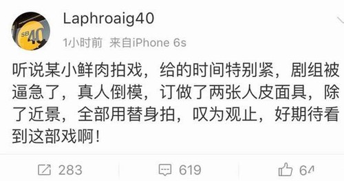 12月8日,有微博名为“Laphroaig40”爆料:“听说某小鲜肉拍戏,给的时间特别紧,剧组被逼急了,真人倒模,订做了两张人.皮面具,除了近景,全部用替身拍,叹为观止!好期待看到这部戏啊!”