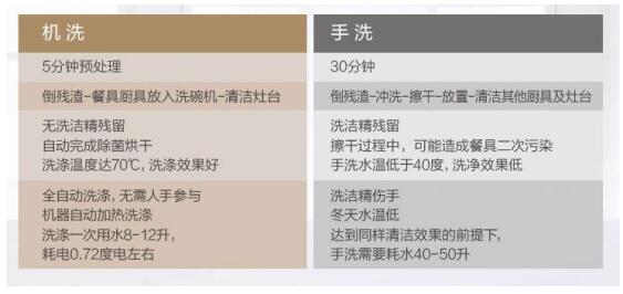 手洗会有洗洁精残留、水温低于40度洗净效果低、耗水可以达到40-50升。但是洗碗机完全不会的洗洁精残留,还能自动除菌烘干没有擦干过程的二次污染。洗涤温度高端70℃,洗涤效果更好。而且洗一次才用8-12升水、0.72度电,真正省水省电。说句不好意思的,比如你花个十几分钟在那里洗碗还不如用着节省出的时间去做点别的有意义的事情呢,比如给公婆、老公削水果啦、整理衣物啦。