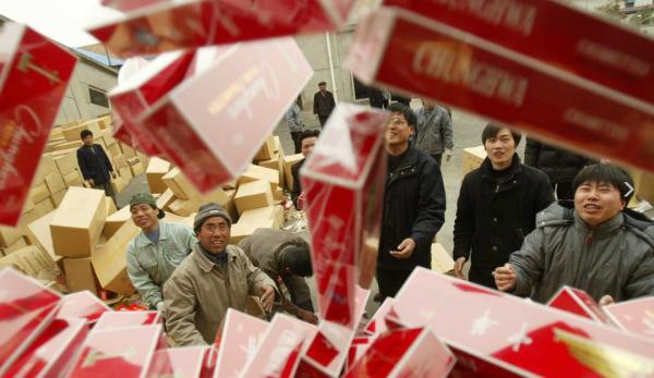 图为2005年3月14日,上海市烟草专卖局将假冒的2360多箱,118000多条,价值1500多万元的各种高档名牌香烟,在奉贤区环保型垃圾焚烧厂销毁。