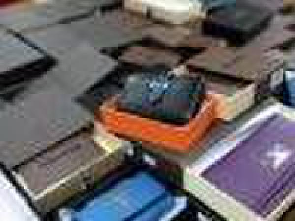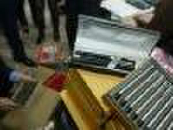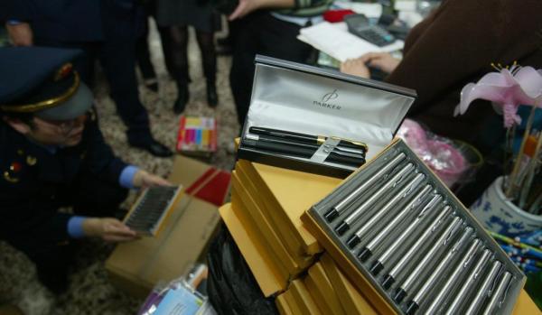 图为2007年4月23日上午,北京市海淀工商分局商标科的执法人员在天成市场的一个摊位上一下查出了800只假冒的“派克”钢笔,同时在另一摊位上查到了近百只假冒的派克签字笔和大量笔芯。