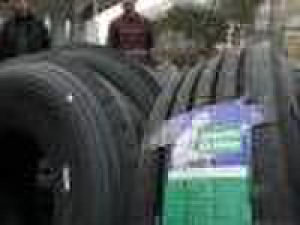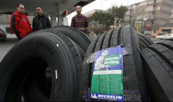 图为2012年3月14日,青岛,被查商店的工人从店铺内搬运出假冒轮胎。