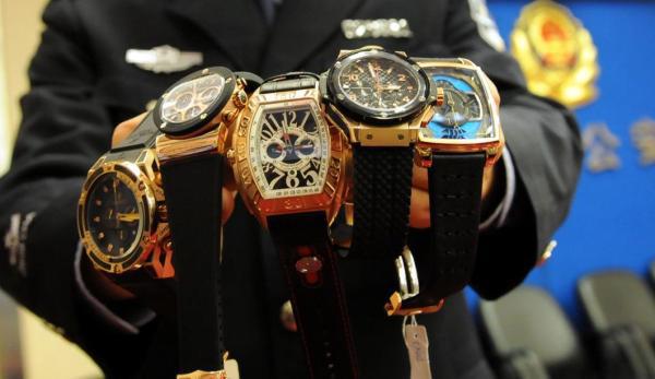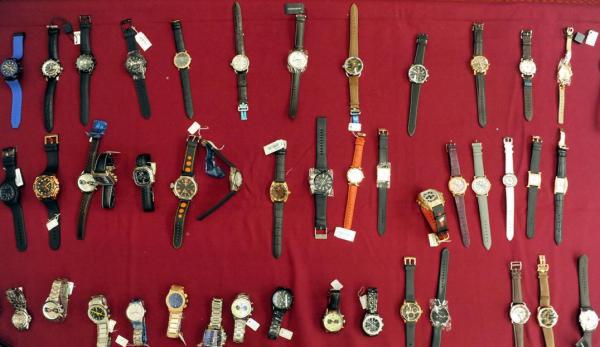 图为2013年04月23日,广东省广州市,警方展示缴获的假冒品牌手表。