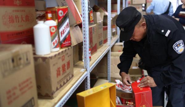 图为2015年11月17日,昆明,警方缴获名牌假酒900多瓶,涉案价值75万余元。