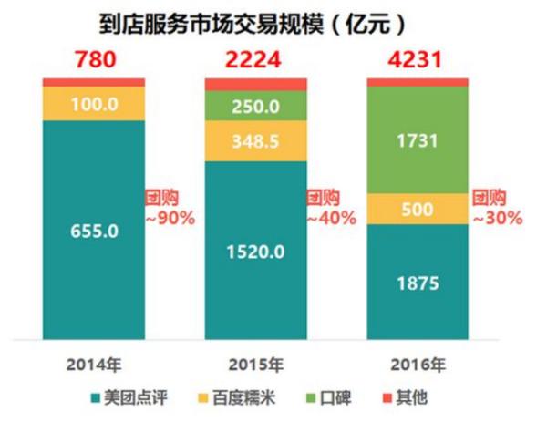 2016年,团购交易占比降至三成左右,到店服务快速发展。O2O到店服务整体交易规模4231亿,在整体市场中占比58%。口碑和美团点评成为到店服务的主要玩家,分别占据了41%和44%的份额。