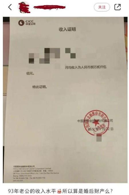 半年前,某券商非银首席分析师小红书上晒工资,后引起舆论热议。7月28日,小红书上又出现了券商晒薪酬事件。网传中金公司一名交易员的夫人晒出了其夫的收入证明,该证明显示其月均收入为82500元。这位夫人问:“93年老公的收入水平,所以算婚后财产吗?”