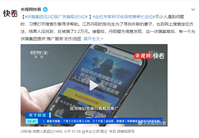 诈骗集团花2亿做广告骗取近5亿。不少人遇到问题时,习惯打开搜索引擎寻求帮助。江苏丹阳的张先生为了寻找失联的妻子,也到网上搜索定位方法,结果人没找到,反被骗了3.2万元,这到底是怎么回事呢?