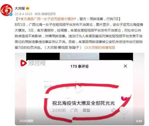 8月1日,广西北海,一女子在短视频平台发布不当言论“祝北海疫情大爆发全部死光光”。8月3日,据网信北海通报,牟某在某短视频平台发布不当言论,对社会公共秩序造成不良影响,涉嫌寻衅滋事。目前,牟某因寻衅滋事被公安机关依法作出行政拘留7日的处罚决定,目前网对于牟某的身份并没有公布。