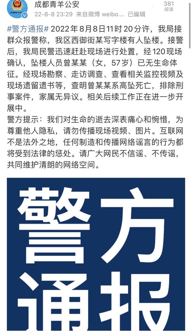 8月8日11时20分许,我局接群众报警称,我区西御街某写字楼有人坠楼。接警后,我局民警迅速赶赴现场进行处置,经120现场确认,坠楼人员曾某某(女,57岁)已无生命体征。经现场勘察、走访调查、查看相关监控视频及现场遗留遗书等,查明曾某某系高坠死亡,排除刑事案件,家属无异议。相关后续工作正在进一步开展中。