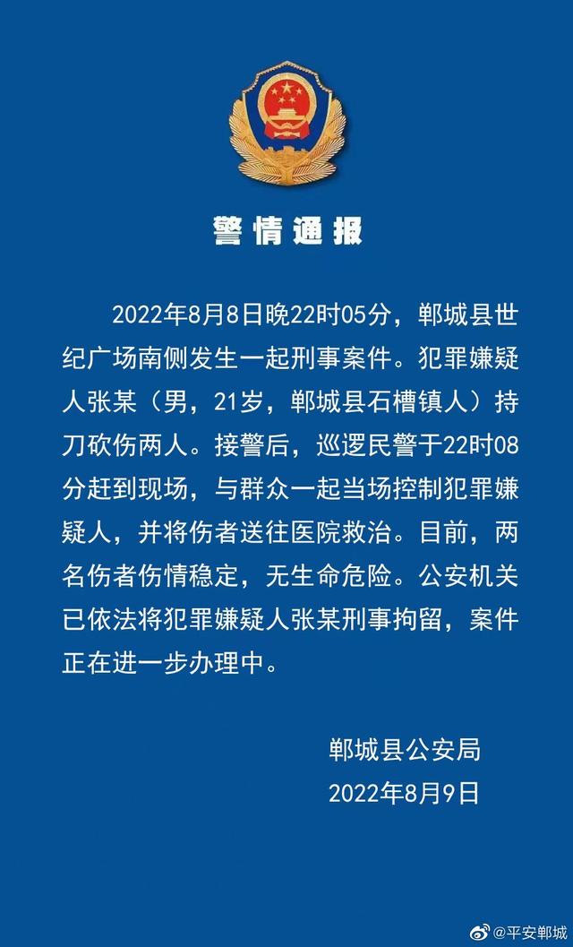 2022年8月8日晚22时05分,郸城县世纪广场南侧发生一起刑事案件。犯罪嫌疑人张某(男,21岁,郸城县石槽镇人)持刀砍伤两人。接警后,巡逻民警于22时08分赶到现场,与群众一起当场控制犯罪嫌疑人,并将伤者送往医院救治。目前,两名伤者伤情稳定,无生命危险。公安机关已依法将犯罪嫌疑人张某刑事拘留,案件正在进一步办理中。
