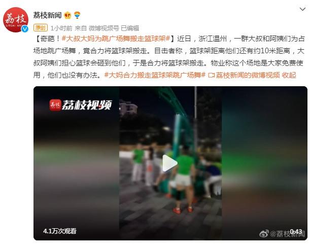 近日,浙江温州,一群大叔和阿姨们为占场地跳广场舞,竟合力将篮球架搬走。目击者称,篮球架距离他们还有约10米距离,大叔阿姨们担心篮球会砸到他们,于是合力将篮球架搬走。