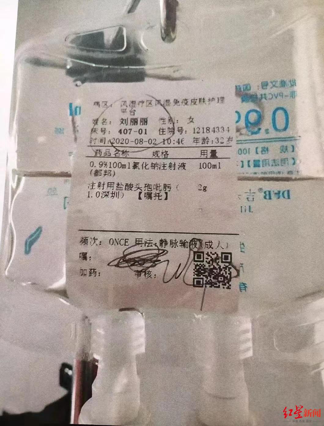 张女士告诉记者,8月2日,她看到医生使用头孢吡肟,便向医生提出质疑,说女儿对头孢过敏,但医生表示可以使用。她便拍下了输液袋的照片,输液袋上的时间为10点46分。