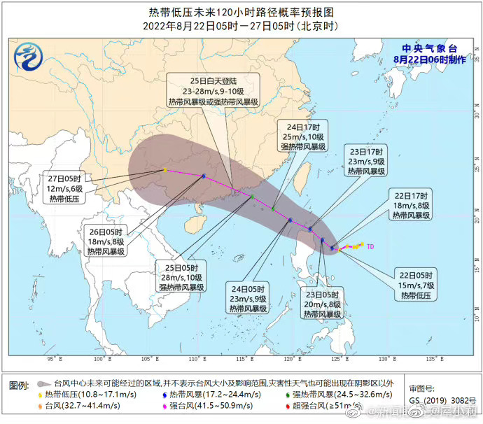预计,低压中心将先以每小时7-10公里的速度向偏西方向移动,22日傍晚以后将转向西北方向移动,并将于22日加强为今年第9号台风。随后将于24日凌晨移入南海东北部海面,逐渐向广东沿海靠近,强度继续增强,最强可达强热带风暴级(10-11级,25-30米/秒),并将于25日白天在上述沿海登陆(23-28米/秒,9-10级,热带风暴级或强热带风暴级)。登陆后,强度逐渐减弱。