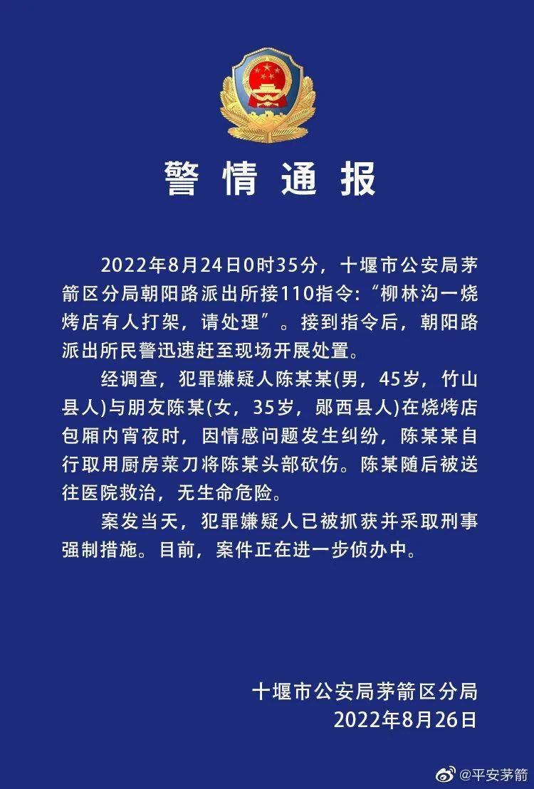 警方通报女子在烧烤店被砍伤 因感情纠纷伤者无生命危险