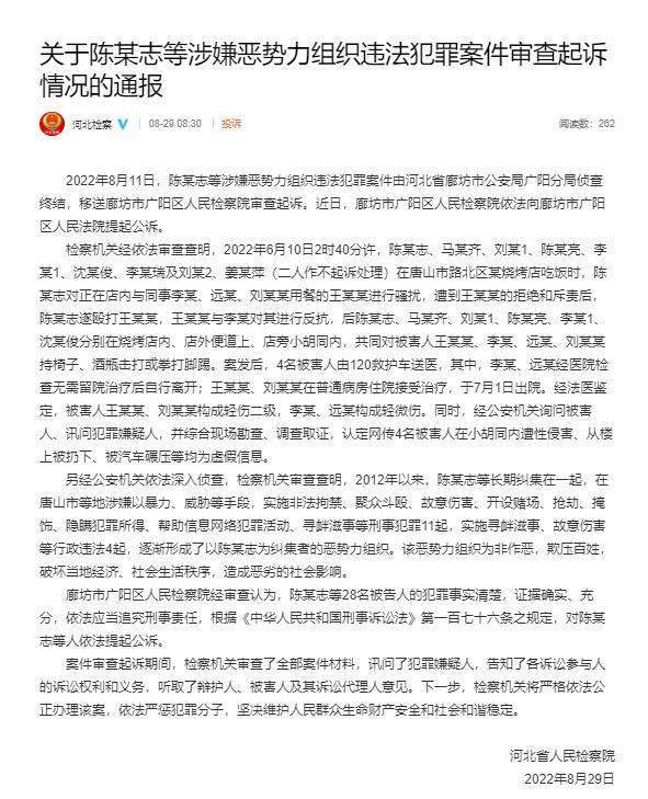 今日山打人案审查起诉情况通报,唐山打人案7人被起诉2人不作起诉,陈某志涉嫌多起刑事犯罪,形成黑恶势力组织 28名被告人被公诉,唐山打人案受害者已出院,被打女子已于7月1日出院。