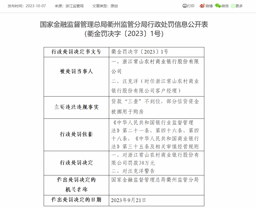 浙江常山农商银行被罚30万:因贷款“三查”不到位等