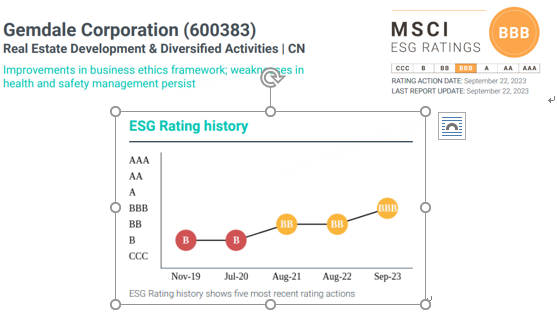MSCI报告显示,金地集团在“公司治理、“商业道德”“产品安全与质量”“绿色建筑”等方面处于行业领先水平。