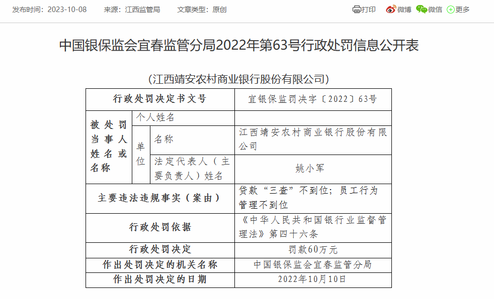 中国网财经10月9日讯 昨日,国家金融监督管理总局网站显示,根据中国银保监会宜春监管分局2022年第63号行政处罚信息公开表,江西靖安农村商业银行因贷款“三查”不到位;员工行为管理不到位,被中国银保监会宜春监管分局罚款60万元;作出处罚决定的日期为2022年10月10日。