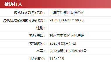 这是上海宝冶集团有限公司一个月内第二次被列为“被执行人”。9月14日,该公司被郑州市中原区人民法院列为“被执行人”,案号(2023)豫0102执5705号,执行标的1184326。