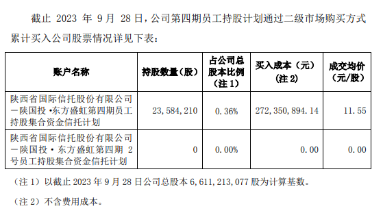 截至2023年9月28日,东方盛虹第四期员工持股计划通过二级市场购买方式累计买入2358.42万股,占公司总股本的比例0.36%,买入成本2.72亿元,成交均价11.55元/股。截至10月9日收盘,东方盛虹每股价格为11.2元。