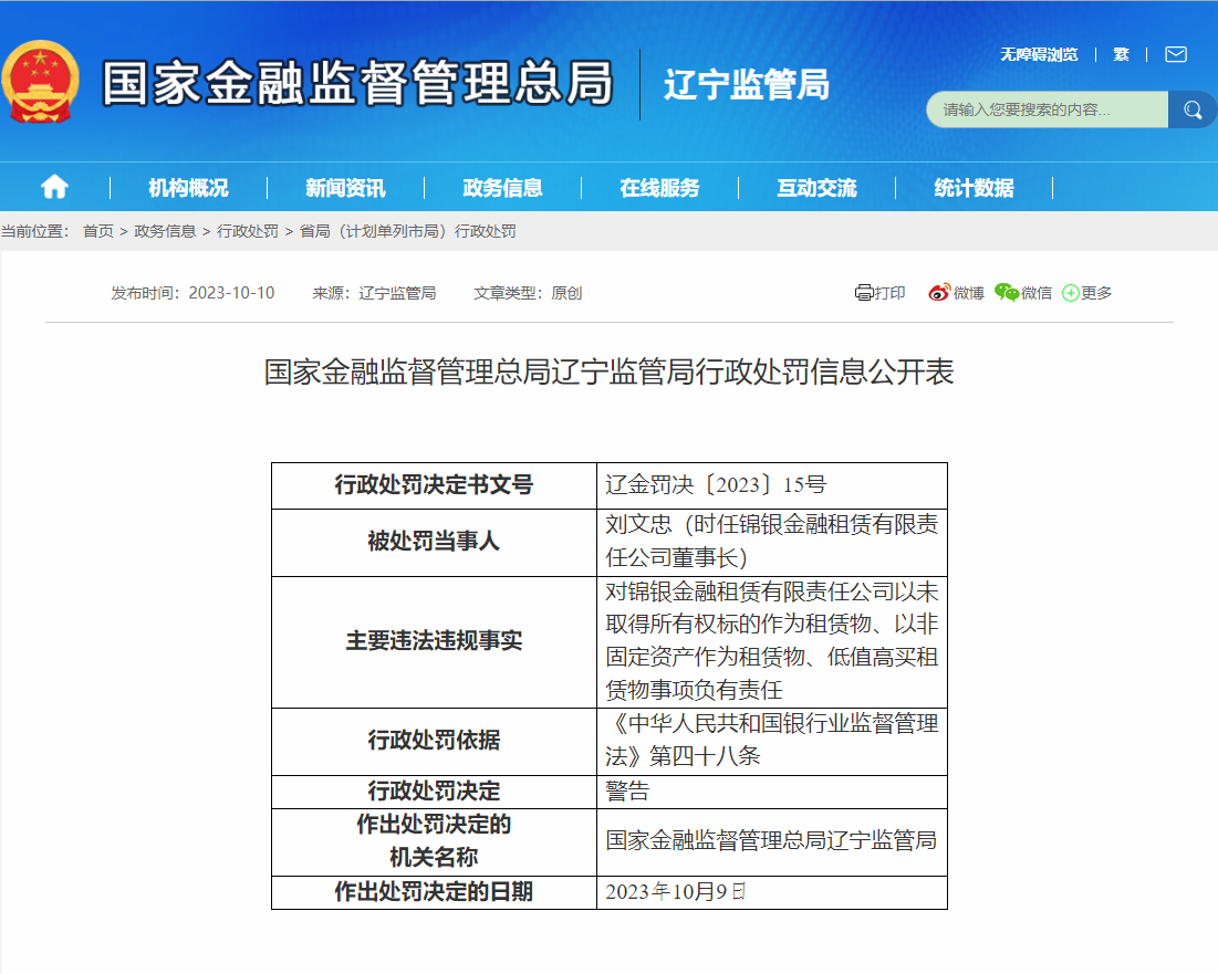 中国网财经10月10日讯 今日,国家金融监管总局公布相关处罚信息显示,刘文忠(时任锦银金融租赁有限责任公司董事长)对锦银金融租赁有限责任公司以未取得所有权标的作为租赁物、以非固定资产作为租赁物、低值高买租赁物事项负有责任,国家金融监管总局辽宁监管局(简称:辽宁监管局)依据《中华人民共和国银行业监督管理法》第四十八条,对其处以“警告”。