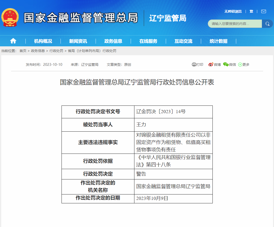 王力对锦银金融租赁有限责任公司以非固定资产作为租赁物、低值高买租赁物事项负有责任,辽宁监管局同样对其予以“警告”处罚。