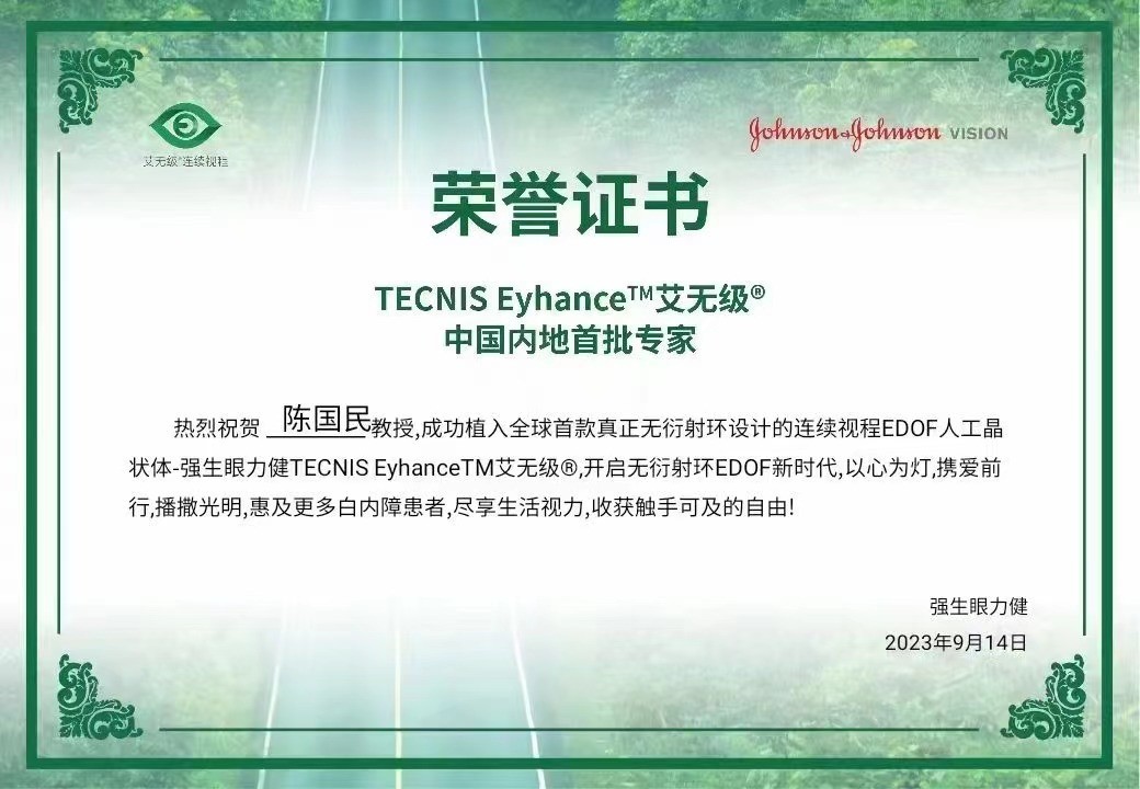 近日,青岛华厦眼科医院的业务副院长、屈光科主任陈国民主刀,成功植入了全球首款采用无衍射环设计的连续视程人工晶状体TECNIS Eyhance™艾无级®,标志着青岛华厦眼科医院白内障人工晶状体手术走在了全国前列。