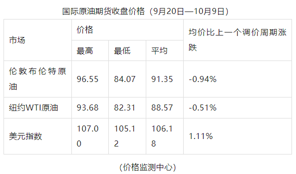据国家发改委价格监测中心监测,本轮成品油调价周期内(9月20日—10月9日)国际油价大幅震荡。平均来看,伦敦布伦特、纽约WTI油价比上轮调价周期略降0.72%。