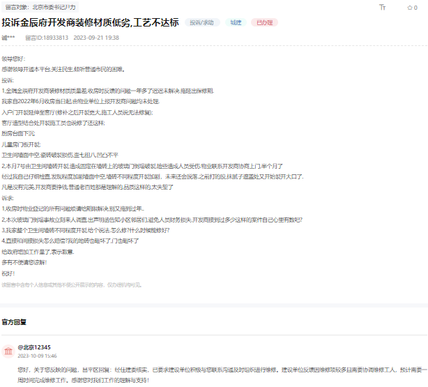 10月9日,北京12345对此作出回复。回复信息如下:经住建委核实,已要求建设单位积极与业主联系沟通及时组织进行维修。建设单位反馈因维修项较多且需要协调维修工人,预计需要一周时间完成维修工作。