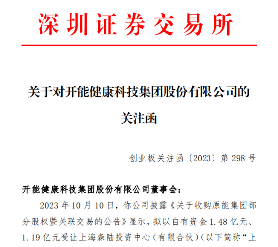 中国网财经10月12日讯(记者 张增艳)日前,因收购原能集团部分股权暨关联交易事项,开能健康收到深交所下发的关注函,要求就交易对价、交易标的经营情况等予以说明。