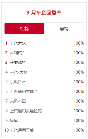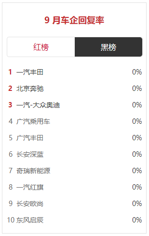 而在车企回复率黑榜榜单上,一汽丰田、北京奔驰、一汽-大众奥迪、广汽丰田、长安深蓝、奇瑞新能源、一汽红旗、长安欧尚、东风启辰9月份的回复率均为0。
