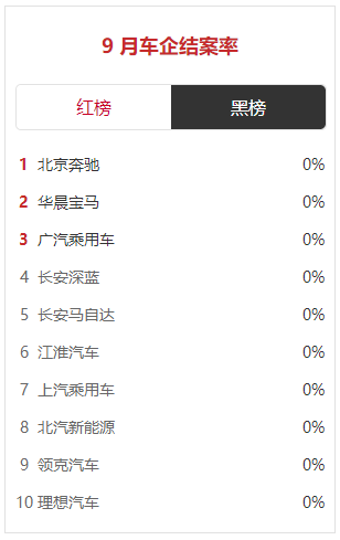 反之,北京奔驰、华晨宝马、长安深蓝、长安马自达、江淮汽车、上汽乘用车、北汽新能源、领克汽车等车企的结案率均为0。