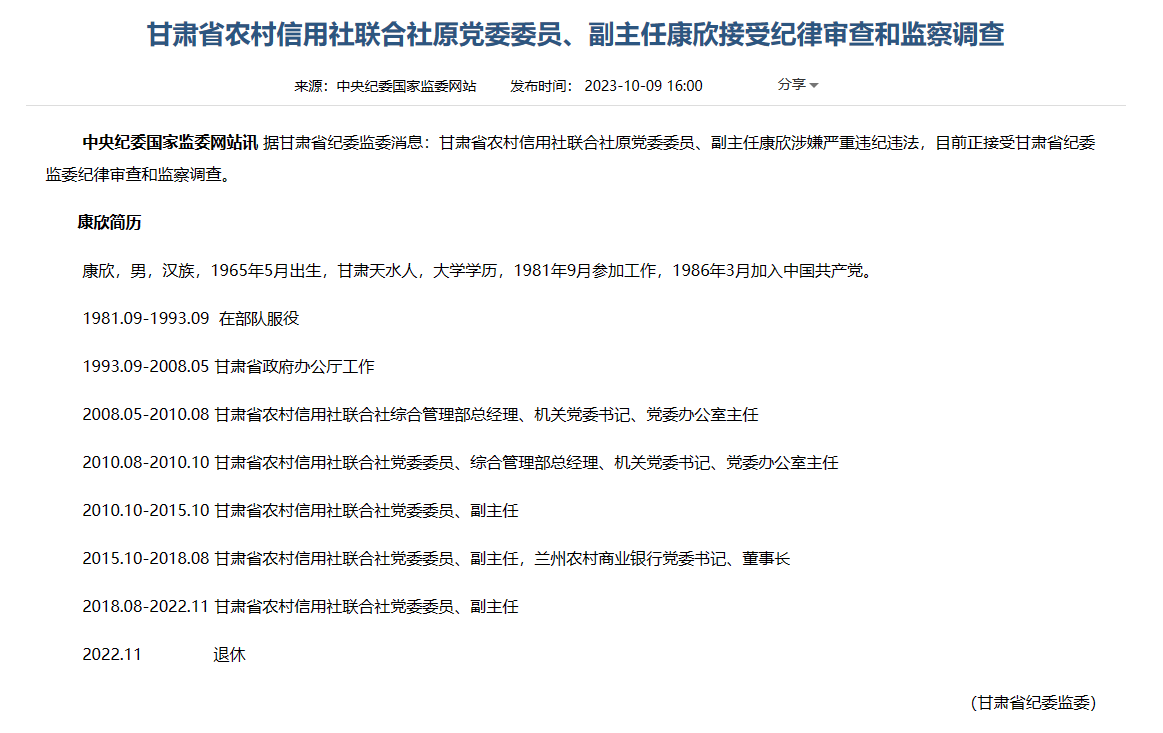 中国网财经10月12日讯 近日,中央纪委国家监委网站显示,据甘肃省纪委监委消息:甘肃省农村信用社联合社原党委委员、副主任康欣涉嫌严重违纪违法,目前正接受甘肃省纪委监委纪律审查和监察调查。