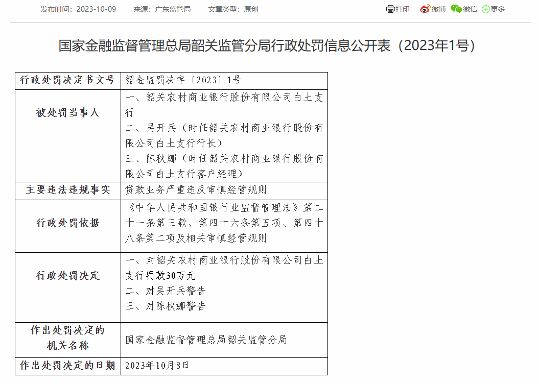 韶关农商银行白土支行被罚30万:因贷款业务严重违反审慎经营规则