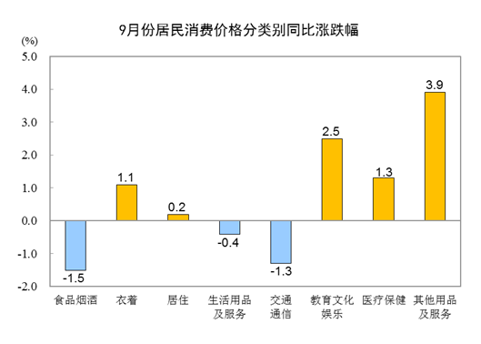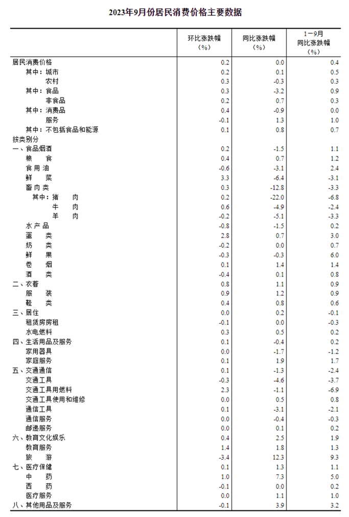 国家统计局:9月份CPI同比持平 环比上涨0.2%