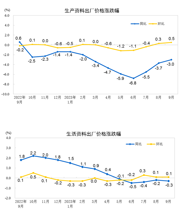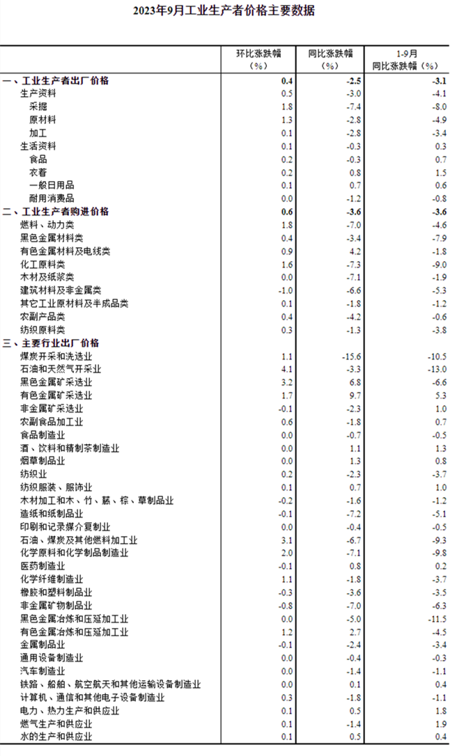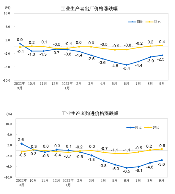 中国网财经10月13日讯 据国家统计局网站消息,2023年9月份,全国工业生产者出厂价格同比下降2.5%,环比上涨0.4%;工业生产者购进价格同比下降3.6%,环比上涨0.6%。1—9月平均,工业生产者出厂价格比上年同期下降3.1%,工业生产者购进价格下降3.6%。