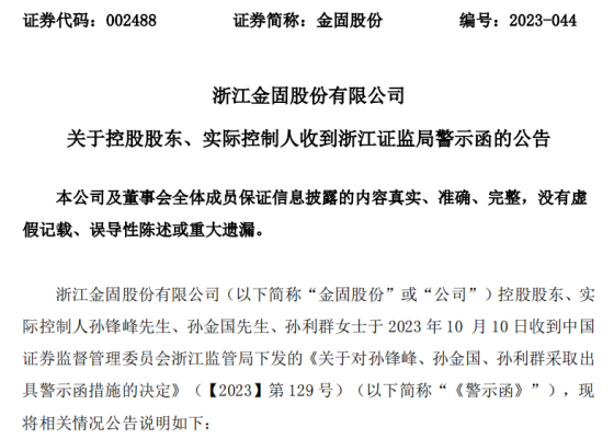 中国网财经10月13日讯(记者 张增艳)金固股份日前公告称,因定增事项中向认购方承诺保底收益,公司控股股东、实控人孙锋峰、孙金国、孙利群于10月10日收到浙江证监局出具的警示函。