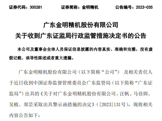 根据《上市公司信息披露管理办法》第52条的规定,广东证监局决定对金明精机以及公司董事长汪帆、总经理马佳圳、财务总监吴植、董事会秘书郑芸等出具警示函,并要求其认真吸取教训,切实加强证券法律法规的学习,依法真实、准确、完整、及时、公平地履行信息披露义务。同时,金明精机应对相关责任人进行内部问责,于收到决定书30日内报送整改报告、内部问责情况,并抄报深圳证券交易所。