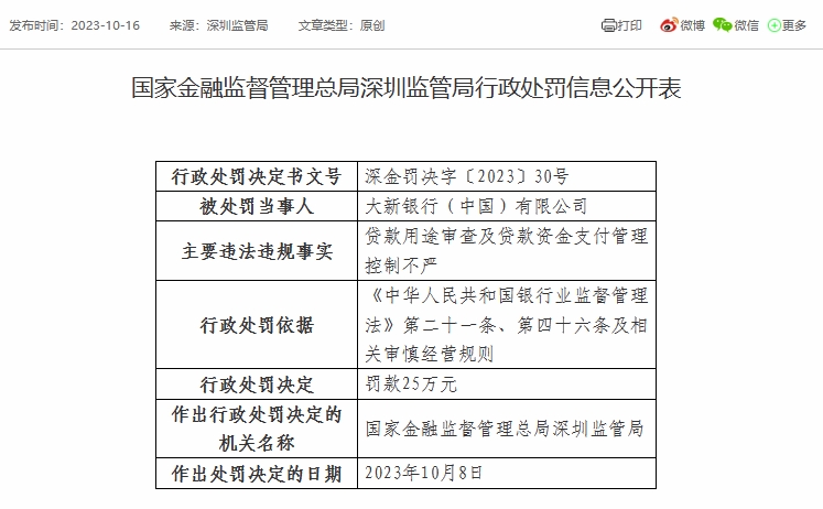 中国网财经10月16日讯 今日,国家金融监督管理总局网站发布的行政处罚信息公开表显示,大新银行(中国)有限公司因贷款用途审查及贷款资金支付管理控制不严,被国家金融监督管理总局深圳监管局罚款25万元,作出处罚决定的日期为2023年10月8日。