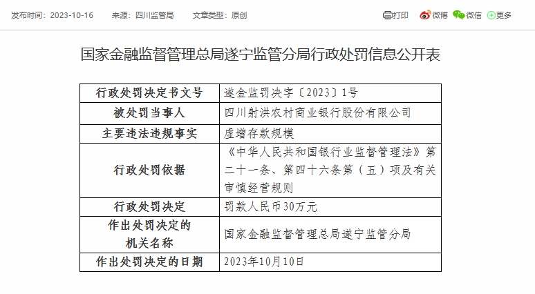 四川射洪农商银行因虚增存款规模被罚30万元
