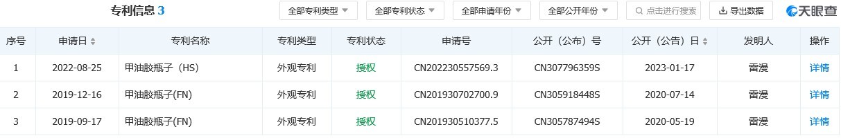 该公司自2019年至今有三项专利信息,但专利类型均为“外观专利”,且均为美甲所用的甲油胶瓶子。
