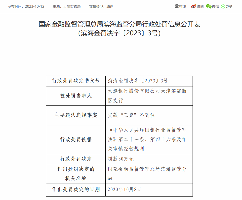 大连银行天津滨海新区支行被罚30万:因贷款“三查”不到位