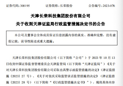 根据《上市公司信息披露管理办法》第53条规定,天津证监局决定对长荣股份出具警示函,并要求认真吸取教训,加强证券法规学习,真实、准确、完整、及时、公平地履行信息披露义务,杜绝此类违规行为再次发生;根据相关规定,对张庆采取监管谈话的措施,要求其于10月27日前携带有效身份证件到天津证监局接受监管谈话。