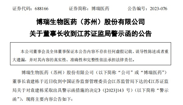 因药效相关言论具有误导性 博瑞医药董事长袁建栋被出具警示函