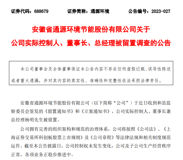 通源环境实控人、董事长兼总经理杨明被留置调查