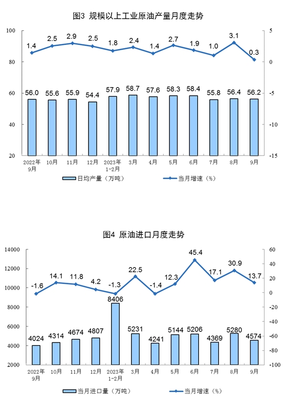 原油生产平稳增长,进口较快增长。9月份,生产原油1687万吨,同比增长0.3%,增速比8月份放缓2.8个百分点,日均产量56.2万吨。进口原油4574万吨,同比增长13.7%,增速比8月份回落17.2个百分点。