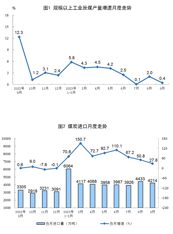 原煤生产保持稳定,进口快速增长。9月份,生产原煤3.9亿吨,同比增长0.4%,增速比8月份放缓1.6个百分点,日均产量1310万吨。进口煤炭4214万吨,同比增长27.8%,增速比8月份回落23.0个百分点。